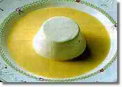 ココナッツのブラマンジェをカスタードソースでいただきます。 ブラマンジェは型に流して作りますが、ゼラチンの量は増やさずに、固める時間を長くして型からあけます。 このほうがフルフルとした口当たりのよさが楽しめます。