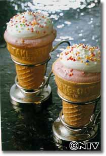 でき上がったスフレ生地を、アイスクリームのコーンカップに流し入れ、生クリームに砂糖少々を加えて泡立てたものを上に絞り出し、カラーキャンデーを飾り、冷蔵庫に入れて冷やし固めます。