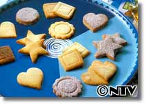 上記の要領で作ったクッキー生地をポリ袋などで包み、冷蔵庫で30分以上休ませます。これをよく練ってから、強力粉をふったふきんの上にとり、めん棒で3mm厚さにのばし、好みの型で抜きます。天板に間隔をおいて並べ、170℃のオーブンで12~13分、きつね色に焼きます。好みでココアや粉砂糖をふりかけます。