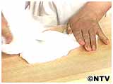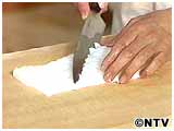 イカの表側に、5mm間隔で厚みの半分まで斜めに切り込みを入れていきます。