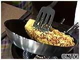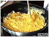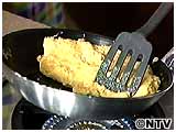 3)全体が半熟になったら、半分に折り、フライパンのカーブを利用して形作ります。