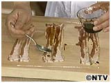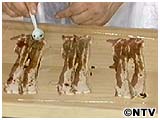 まな板の上にラップをひろげ、豚肉をのせ、しょうゆをおとします。