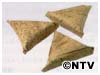 4)指で竹の皮を三角に保ちながら炒めたもち米と具を詰める。