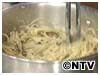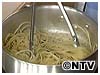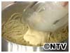 1)茹であがったパスタをベーコンがカリカリになっている鍋に入れ、油をからませます。この時、パスタが油を吸ってしまうので、茹で汁少々を足すとよい。