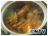 スペアリブが煮汁から出てしまうくらいまで煮つめ、最後に強火にして鍋をゆすり、照りをつける。