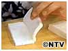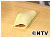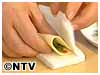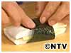のりをゆるめに巻き、巻き終わりに水をつけてとめる。(焼くとはんぺんがふくらむのでゆるめに巻く)