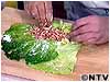 1) ゆでて、冷ました白菜を表側を下にして耐熱皿の幅に合わせて2枚ひろげ、筋の固いところは包丁の背で叩きます。