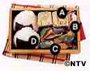 A 野菜入り卵焼き B かぶの即席甘酢漬け C 豚肉とピーマンのみそ炒め 一口大に切った豚肉、ピーマンを油で炒め、みそ、だし汁、しょうゆ、みりんで調味し、汁気がなくなるまで炒りつける。 D のり巻きおむすび