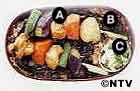 A 鶏肉と夏野菜の揚げ照り 彩りよく竹串に刺す。 B のりごはん ごはんに削りがつおとしょうゆを混ぜ、弁当箱に詰め、上にのりをちぎってのせる。 C きゅうりとキャベツの浅漬け 薄切りのきゅうり、細切りのキャベツ、しょうがと昆布のせん切り、レモンの薄切りを混ぜて塩をし、重石をしてしばらくおき、水気を絞る。
