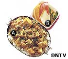 A 豆腐のカレーの卵とじ 小鍋に豆腐カレーを煮立たせ、溶き卵を流し入れとじる。ごはんにのせ、パセリのみじん切りをふる。 B フルーツ うさぎりんご、くし形に切ったオレンジを詰め、クレソンを添える。