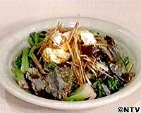 材料: ほうれん草(1わ) ピータン(1個) 半熟ゆで卵(1個) せん切りしょうが(1かけ分) たれ 甜麺醤(大さじ1/2) しょうゆ(大さじ1/2) 酒(大さじ1/2) 酢(小さじ1弱) ごま油(大さじ1) 作り方: (1) ほうれん草はゆでて、食べやすい長さに切り、器に盛っておきます。 (2) ゆで卵は手で割り、ピータンは包丁の背でつぶして(1)にのせます。 (3) せん切りのしょうがものせ、たれの調味料を合わせてかけ、全体をあえます。