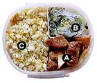 A たけのこと豚肉の中華煮 B 春雨ときゅうりのあえもの もどした春雨は食べやすく切り、きゅうりのせん切りは塩をして水気を絞り、ごま油、酢、砂糖であえてごまをふる。 C 卵チャーハン 卵を炒めてごはんを炒め合わせ、塩、こしょうし、ねぎのみじん切りを加えてひと炒めする。