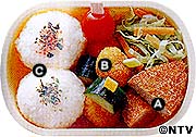 A かつおのフライ せん切りのレタスとにんじんを添えて詰める B うずら卵の串刺し ゆでたうずら卵をフライにし、きゅうり、プチトマトと適宜に串に刺す。 C おにぎり 丸くにぎり、ふりかけをふる。