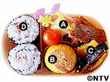 A 牛肉のミニッツステーキ ステーキを小さく切り、プロセスチーズ、きゅうり、トマトと一緒に串に刺す。 B かぼちゃのシナモン焼き 電子レンジでやわらかくしたかぼちゃをラップで形作り(皮は除く)、シナモンシュガーをふってオーブントースターで焼く。 C 皮のきんぴら Bの皮をせん切りにしてごま油で炒め、みりん、しょうゆで調味し、白ごまをふる。 D 鳴戸のり巻き 梅肉を芯にのり巻きを作り、小さく切る。