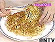 フライパンに多めの油を熱し、酒としょうゆをまぶしためんを広げる。(めんは2玉ずつ焼きます。)