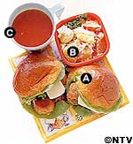 A 大豆ミートボールバーガー バンズパンに切り込みを入れ、バターとマスタードをぬり、サラダ菜類、薄切りチーズ、半割りの大豆ミートボールをはさみ、トマトケチャップを絞る。 B さつま芋のサラダ C 野菜トマトジュース