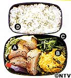 A チキンガランティーヌ レタスを敷いてチキンガランティーヌを詰め、ソースを添える。 B かぼちゃのミルク煮 C ほうれん草のソテー ゆでて3cm長さに切ったほうれん草を油で炒め、塩、こしょうする。 D ごはん ドライパセリと塩を混ぜたものをふる。