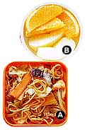 A オイスターソース焼きそば 中華丼の具をとり分けて使う。豚肉、えび、野菜を炒めて中華麺をほぐしいれ、水を少々入れ、オイスターソース、しょうゆ、こしょうで調味する。 B フルーツ りんごは皮と種を除き、オレンジはよく洗ってくし型に切る。