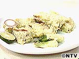 余った衣でたらの芽を揚げて添えます。 (他のものでも、おうちにあるものでどうぞ)