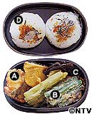 A さばの辛子揚げ 食べやすい大きさに切り、アスパラとともに詰める。 B いんげんのみそマヨネーズあえ C 昆布の佃煮(市販品) D ラップおにぎり ラップにふりかけをふり、その上にごはんをのせて包み、丸くにぎる。