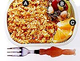 A きのこのヘルシードライカレー カレーときびごはんを混ぜ合わせて詰める。 B ミックスビーンズとチコリのサラダ C オレンジ 皮ごと食べやすく切る。