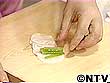 甘酢につけたかぶ5枚をずらして並べ、茎をのせてくるむように巻きます。