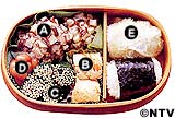 A 椎茸シューマイ B にんじん入り卵焼き にんじんのせん切りを油で炒め、みりんとしょうゆで調味した溶き卵を流し入れ、半熟に火を通して巻き、焼き上げる。 C 青菜のごまびたし ゆでた青菜をしょうゆで調味し、巻きすで巻いて一口大に切り、切り口に炒りごまをつける。 D 煮豆 E おにぎり 俵型のおにぎりに、ひとつはおぼろ昆布、ひとつはのりを巻く。