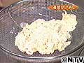 豆乳の表面に膜がはってきたら、菜箸ですくいとる。(盆ざるにのせておく)