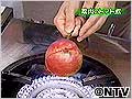 トマトにフォークを刺してコンロの火にかざすと、皮がパチッとはじける。すぐに水にとって皮をむく。