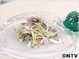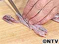 三味線のバチの形になるように、上下の幅を変えながら包丁を入れて引き切りにする(バチ切り)。ボリュームが出て盛り栄えがする。