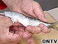 皮の引き方 身と皮の間に人差し指を入れ、中心から左右に指を進めながら片身をはずす。180度向きを変えて残りも同様にはずす。