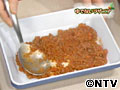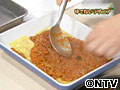 (3) ミートソース、ホワイトソースの順にのせ、ラザニアをミートソースではさむようにして重ねる。
