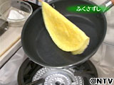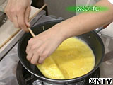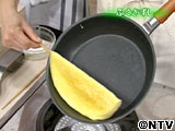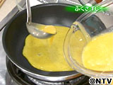 (1) フライパンに油をペーパーで広げ、いったんぬれ布巾にとって温度を下げてから、卵液を流す。