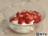 ■ 材料 いちご・・・20粒 黒酢・・・小さじ1 砂糖・・・大さじ2 プレーンヨーグルト・・・1パック(500g) ■ 作り方 (1)いちごはヘタをとり、小さく刻んで砂糖と黒酢をまぶして少しおく。 (2)ヨーグルトはザルにペーパーを敷いた上にあけてしばらくおいて水気をきる。 (3)器にヨーグルトを盛り、汁気がでた(1)をかける。