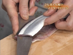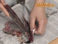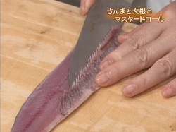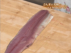 三枚におろしたさんまは、そぎ切りにして、巻き終わりが薄くそいだ部分になるように巻きます。