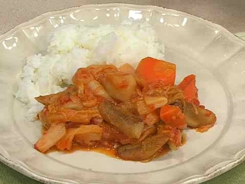 火加減がポイント、最初は強めの中火で10分ほど煮、煮立ってきたら弱火で煮込みます(野菜の水分の出具合で加減する)。