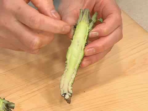 生わさびは上から使いましょう(下のほうは水っぽい)。上の葉の部分や黒いところを削いでからおろす。