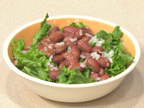 土鍋保温でもどした豆はそのままサラダに使える。器にちぎったサニーレタスを敷き、豆をのせ、玉ねぎのみじん切りを散らし、キユーピー すりおろしオニオンドレッシングをかける。