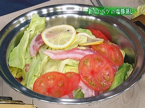 鍋に直接キャベツ、肉、レモン、トマトの順に重ねていってOK。キャベツがぴっちり入る大きさのものがよい。