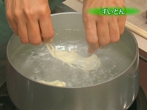 煮汁とは別に、すいとん生地を熱湯でゆでおくのがポイント。