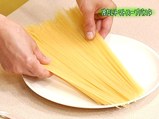 これが極細のパスタ、カッペリーニ、スープにからみ易く喉越しもよい。 袋の表示時間よりも2分長くゆでる。