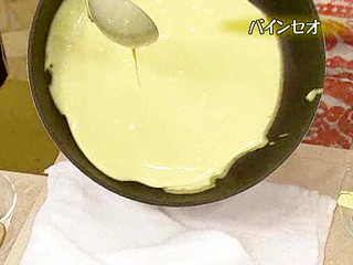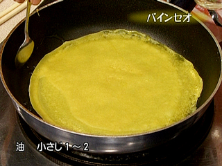 (1)熱したフライパンに油をぬり、一度ぬれ布巾の上にとり、鍋底を冷ましてから生地を流す。