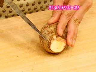 里芋の皮に切り込みを縦に2箇所入れておくと、後で皮がむき易い。