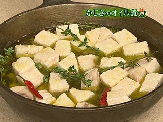 材料:4人分 かじき・・・3切れ(300g) 塩・・・小さじ1 こしょう・・・少々 にんにくのみじん切り・・・2かけ分 オリーブ油・・・約1/2カップ タイム・・・5枝 赤唐辛子・・・2本 ・パン 作り方 (1)かじきは2cm角に切り、塩、こしょうをし、小さめのフライパンに入れる。 (2)(1)ににんにく、オリーブ油(かじきの高さ半分浸る位)を入れ、タイム、赤唐辛子をのせて中火にかけ、フツフツしたら弱火にして約1分煮、返してさらに弱火で1~2分煮る。パンを添えてどうぞ。