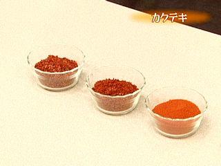 完熟した赤唐辛子を乾燥させてひいたもので、粗びき、中びき、粉末の3種類がある。粗びきは種ごと粗くひいたもので辛みが強い。写真は中びきで、種を除いて細かくひいたもの。用途が広く、家庭ではこの1種類があればいろいろに使える。