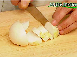 かぶは厚みを同じになるように切る。(くし形では炒めてる途中に角が崩れてくる)。