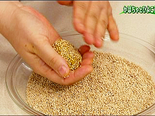 たねがやわらかいので、白ごまをつけならが成形するとよい。