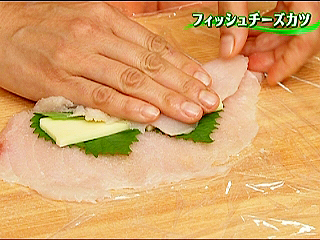 かじきは倍の大きさになるまで伸ばして、青じそとチーズをのせて上下両端をたたむ。