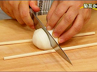 かぶの前後に割り箸を置いてはさんでおくと、切り離す心配がない。 切り込みを入れた裏側には、十字に切り込みに入れておく(かくし庖丁)。