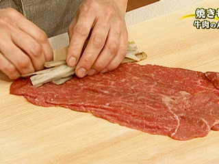(1)下味をまぶした牛肉を斜めにおく(こうすると食べ易い)。
